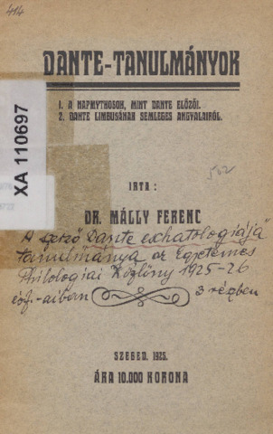 Málly Ferenc: Dante tanulmányok : A napmythosok, mint Dante előzői ; Dante limbusának semleges angyalairól.