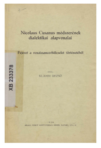 Klamm Rezső: Nicolaus Cusanus módszerének dialektikai alapvonalai : fejezet a renaissance-bölcselet történetéből.